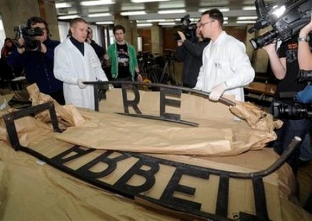 波兰警方对失而复得的奥斯维辛集中营标语牌进行了“精确到毫米”的检查,这个“劳动换取自由”的(Arbeit Macht Frei)标语牌已经被盗贼切成了3段,每段上有一个单词,“Frei”上的字母“i”被盗贼丢弃在案发现场,已经顺利找回。现在,悬挂在奥斯维辛集中营大门上方的是一个一模一样的复制品。