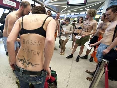 他们身着很少的衣服,一些人还在自己裸露的皮肤上写着:谁来保护我们的隐私?他们还在微型博客网站Twitter上写道:“你们无需对我们进行安检了,因为我们已经赤身裸体了。”