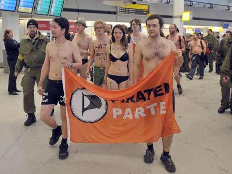 据德国《图片报》1月10日报道,当地时间周日下午,德国“海盗党”(一个宣传保护个人隐私的小党派)的约15名成员在柏林机场A航站楼半裸抗议政府引进更为严格的机场身体扫描设备。