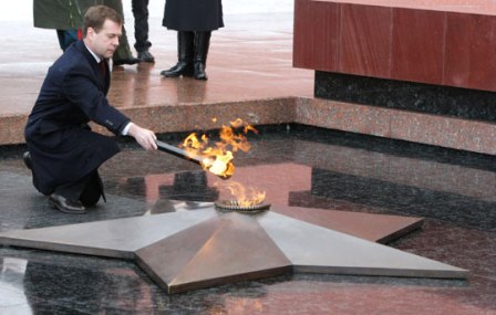 中新网2月24日电 据俄新网报道,俄罗斯总统梅德韦杰夫23日上午出席了隆重的纪念俄无名烈士的长明火“回迁”仪式,并亲自点燃长明火火种。