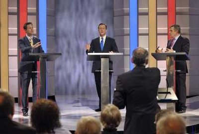中新网4月16日电 据法新社报道,英国三大政党党首15日举行英国有史以来首场选举电视辩论,事前不那么被看好的自由民主党党首克莱格爆冷赢得首场辩论,在辩论后的民意调查当中战胜执政党工党党首布朗和在野保守党党首卡梅伦。