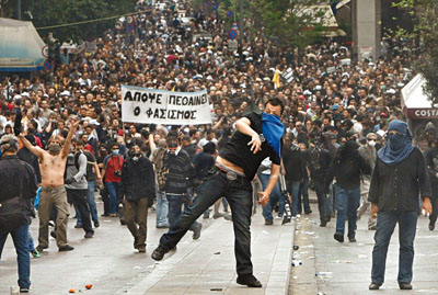 数万名来自公职和私营两大工会的成员昨日走上雅典街头,高举“国际货币基金组织和欧盟盗走了一个世纪的社会发展”、“富人需为危机负责”等横幅,对政府实行严厉的财政紧缩政策表达不满。