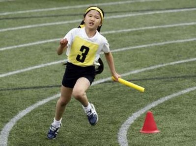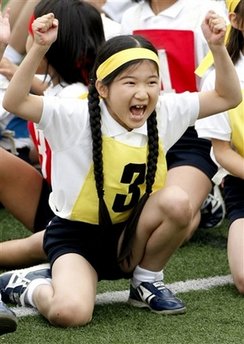 中新网10月18日电 日本皇太子德仁的7岁女儿爱子,17日头缠黄色头巾参加校内接力跑夺冠。