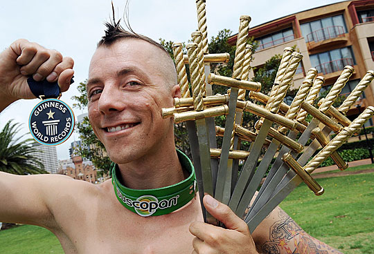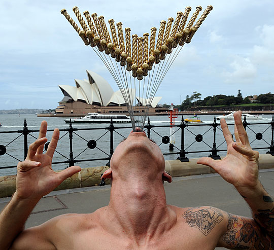 33岁的柴恩是杂技表演者,从16岁开始学习吞剑,平日练习时都吞塑料管,逐渐发展到可以同时吞下18只剑。今天他在悉尼一个公开场合,把18只剑塞入喉咙,剑柄留在嘴的外面。这18只剑,每只都有72厘米长,他吞下去的长度,至少也有30厘米。