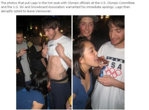 日前,一些关于拉戈在比赛后庆祝胜利尽情放松的照片在互联网上流传。从照片上看,拉戈与朋友们的庆祝方式极为不雅,他因此被斥为美国队的耻辱。照片中,拉戈在温哥华市内的一处房屋内,身着美国队训练服,佩戴着刚刚获得的铜牌,而一名不知名的女子在他的腰部左右的位置亲吻拉戈的奖牌。