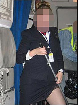 照片中的这些英航空姐穿着独特的红、白、蓝色的制服,撩起裙子后丁字裤显而易见,露出臀部和性感丝袜。