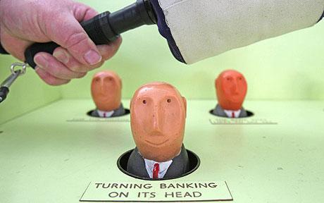 据英国《每日电讯报》12月13日报道,经济衰退下,英国近日流行一种“敲银行家”(Whack a banker)的游戏,玩家只需支付40便士(约合人民币4.5元),就可以在银行家弹出时重击他们,为自己出气。