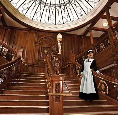 入场费相当于13镑,访客会得到一张登船证,但印于证上并非访客的姓名,而是其中一名当年死难者的姓名。船舱里最惹人瞩目的是一条依样画葫芦地仿制的豪华大楼梯,其造价高达675000镑。连75名船上职员的衣著也是仿照当年的款式,他们熟稔“泰坦尼克”号及其沉没意外的资料,持三等票的“乘客”进入头等舱参观时,他们甚至会开玩笑地著他们回去。