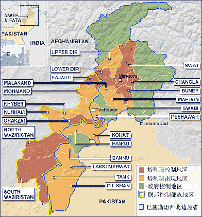 中新网5月14日电 由BBC所制作的一份关于巴基斯坦西北边境省份的地图显示该省只有38%以及周围的地区掌握在政府的控制之下。
