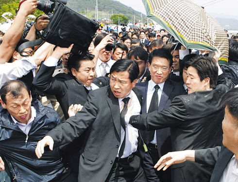 23日,和随行人员一起乘坐大巴来到峰下村的韩国国务总理韩升洙在村子的入口处被“热爱卢武铉的人们的集会(卢爱会)”会员和村民拦住。