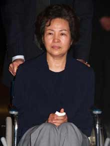 在25日卢武铉入殓仪式之前,权良淑女士眼中满含泪水,从庆尚南道金海市峰下村坐轮椅前往了灵堂。