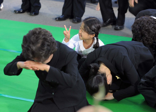 中新网5月29日电 据韩国《朝鲜日报》报道,韩国前总统卢武铉的出殡仪式29日凌晨在庆尚南道金海市进泳邑峰下村举行。图为,儿子卢建昊、夫人权良淑等遗属和卢武铉执政时期的政府人士们为故人行大礼的那刻,卢武铉的孙女向遗像作V型手势。