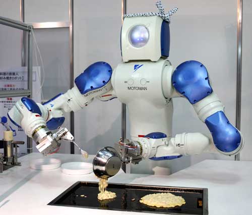 据悉,国际食品工业展9日在东京开幕。当天,会做饭的机器人向在场的观众大秀技艺,展示只要有材料,机器人也确实能把面粉做成煎饼的。