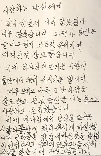 信中称:“在一起生活的过程中我犯下的错误太多了。但你总是宽容地原谅一切过错,还很爱惜我,真的很感谢你。希望今后能在上帝温暖的爱的怀抱中安息。你挺过了极其苦难和悲伤的人生,我真的很爱、很尊敬你。你的妻子李姬镐。”