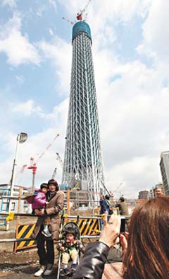 东京天空树预计两年后落成,随着工程进展每天都在增高,29日高度已达338米,超越了高333米的东京铁塔,成为日本第一高塔。