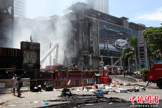 离此咫尺之遥的便是曾被曼谷人引以为豪、号称亚洲第二大的森特沃购物中心,19日下午被人放火燃烧。记者在现场看到,该楼的部分建筑已经垮塌,三支高压水龙正对着垮塌处喷水。据称,当天搜救人员从废墟中发现一年龄大约35岁男子的尸体。官方初步估计,曼谷19日晚至20日晨火灾造成的损失或达数十亿美元。