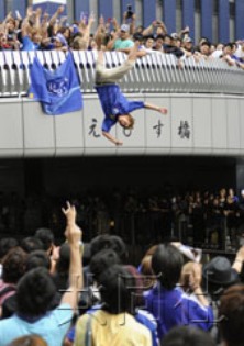 报道称,大批身着日本队蓝色队服的球迷涌上街头占据了十字路口,甚至还有球迷跳入河中用这种奇特的方式庆祝胜利。比赛结束约20分钟后,第一名球迷跳入河中,随后又有50余人高呼万岁跳进河里,连早有防备的在场警察也无法劝阻。