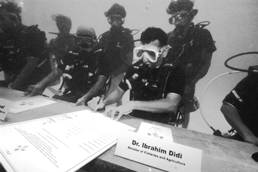 17日,马国总统及12名内阁部长穿上全套潜水装置,在约6米深的海底,召开海底内阁会议。每位阁员由1名潜水教练和1名保镖陪同。