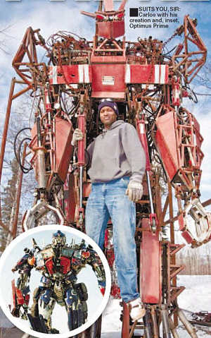 从2005年开始,卡洛斯正式将自己的理想付诸实施。令人惊讶的是,卡洛斯历时4年时间、花费1.5万英镑,日前竟真的在自己家的花园中打造出了一个真实版的变形金刚!据悉,卡洛斯的变形金刚是根据《变形金刚》电影中的主角——汽车人首领“擎天柱”的形象打造的,这个庞然大物高达5.5米、重达1吨,浑身由数千个金属部件组成,就如同电影里描述的一模一样。