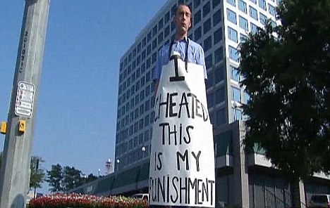 中新网8月28日电 据英国媒体27日报道,一名英国男子因和女人私通,东窗事发后被愤怒的妻子在颈上挂了一个写着“我欺骗,这是我的惩罚”的告示牌,罚站街示众。