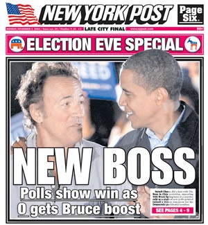 据美国《纽约邮报》3日报道,美国当地时间11月2日,奥巴马一家在俄亥俄州克利夫兰的竞选集会上与著名美国摇滚歌手布鲁斯斯普林斯廷同台献艺。新一轮民调显示,离大选还有最后一天,奥巴马已经赢了。该报封面用“新老板”来称呼胜利在望的奥巴马。该报称:斯普林斯廷用歌声表达了对奥巴马的赞扬。据悉,1984年大选中,获胜的里根曾引用斯普林斯廷的歌词以争取年轻人的选票。