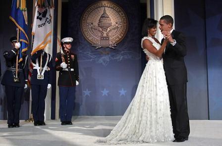 奥巴马的装束为燕尾服配领结,第一夫人米歇尔(Michelle)则身穿出自设计师吴季刚(Jason Wu)之手的露肩晚礼服,礼服带有长长的裙摆。两人在参加完当天的仪式和庆典后就一直穿梭忙碌于各种社交活动。