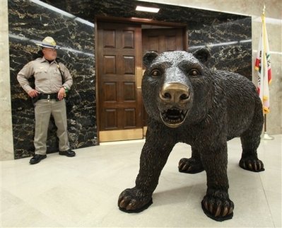 中新网4月8日电 美联社消息,美国加州州长施瓦辛格7日有惊人之举,他把一座113公斤重的灰熊铜像,摆放在加州议会大厦的走廊里。这座灰熊铜像制作地栩栩如生,但看上去过于凶猛。