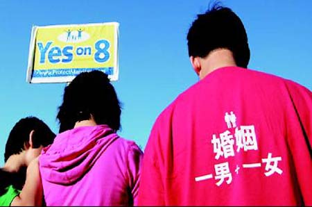 在11月4日举行的美国大选投票中,一项反对同性婚姻的提案因为得到超过半数选民的支持而获得通过。这一被称为“8号提案”的加州立法提案在选举之前引起广泛关注:投票结果显示有大约52.5%的加州选民支持这一提案,而选举结果的公布也意味着在加州实行了几个月的同性合法婚姻制度的夭折。