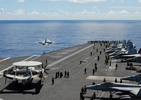 在整个航行过程中,由“华盛顿”号航空母舰、“考彭斯”号导弹巡洋舰、“麦凯恩”号驱逐舰和“布法罗”号核动力攻击型潜艇组成的海上编队进行了作战数据库更新、通讯和战术数据链调试,并开展了多次编队防空、反潜以及对陆模拟攻击演习。