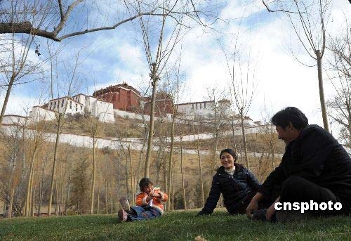 3月20日,拉萨市一个三口之家在布达拉宫下的宗角禄康内休闲娱乐。