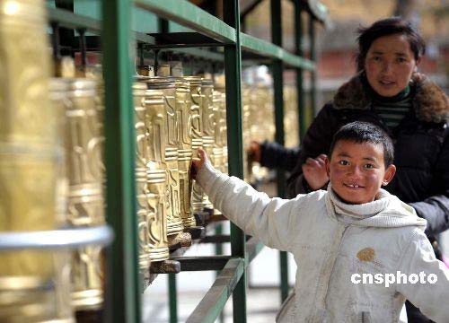 3月20日,一名可爱的拉萨儿童在布达拉宫北侧转经。