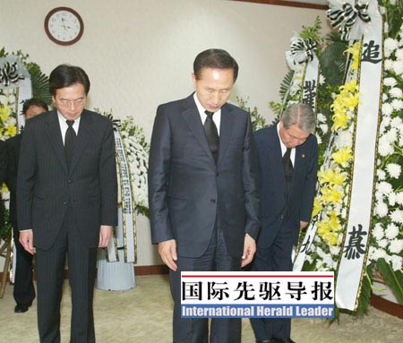 5月22日下午,一身深色西装的李明博,脸色凝重,出现在中国驻韩国大使馆设立的“5•12四川地震遇难者”吊唁堂内。鞠躬默哀,敬献花圈之后,李明博在吊唁簿上留言表示要与中国“共担悲痛”,并强调,“韩国将不遗余力地协助中国政府抗震救灾”。