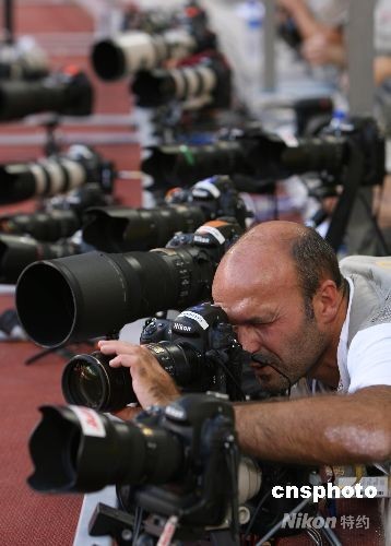 8月15日,北京奥运会田径比赛在国家体育场“鸟巢”内揭幕,摄影记者提前布置遥控摄像装置,迎接本届奥运会首枚田径金牌的诞生。中新社发 武仲林 摄