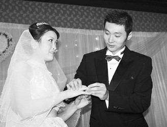 刘炜深情地为新娘戴上婚戒 洪南丽