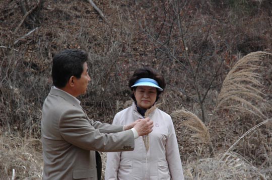 2008年3月13日,卢武铉在私宅附近田间散步时,向夫人权良淑女士讲解关于一些植物的情况。