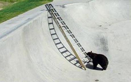 据当地居民介绍,因为滑板场地是一片混凝土浇筑的凹下去的场地,四壁很陡表面很滑,笨重的大黑熊掉下去后不容易爬上来,人们发现它时,它显然已被困了一夜。相关动物保护人员那来了一个梯子,这只聪明的熊最后竟然自己顺着梯子爬了上来,然后慢慢走开了。
