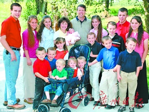 本报讯 米歇尔和丈夫吉姆·达格尔24年前结婚。婚后第4年,21岁的米歇尔生下第一个孩子,是个男孩,取名乔希。之后,孩子以平均一年一个的速度降生。而达格尔家的规模越来越庞大。