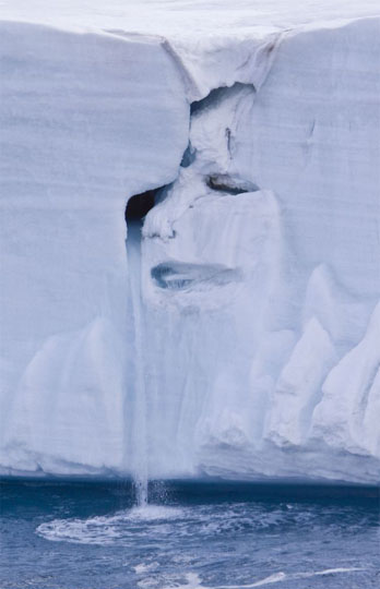 这张照片由海洋摄影师和环保讲师迈克尔•诺兰(Michael Nolan)拍摄。诺兰每年都会外出考察冰川和野生动物。这张照片中的可怕面孔似乎在警示人们全球变暖等环境问题令人担忧,连大自然似乎都在忧伤。