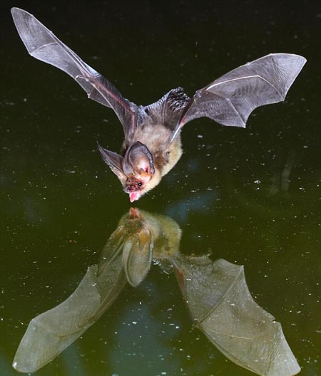 中新网9月18日电 一只口渴的蝙蝠扑向池塘,准备消解它的燃眉之渴。在这电光石火的瞬间,它的身影清楚反映在碧绿的池水上。