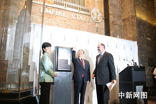 当地时间9月30日晚,纽约地标建筑帝国大厦将为新中国成立六十周年亮起象征中国的“红黄红”三层双色彩灯,图为中国驻纽约总领事彭克玉当天上午主持亮灯仪式,拉下点灯电闸。当晚,帝国大厦顶端将如图中模型所示,以“中国颜色”示人,为中国国庆添彩。作 者:魏晞