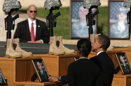奥巴马在遇难者悼念仪式上发表了讲话。登上讲台后,他示意聚集现场听众安静下来,然后开始逐一介绍每一名遇难者的姓名、军衔、履历等,回顾了他们的家庭、生活情况以及对军队的贡献。