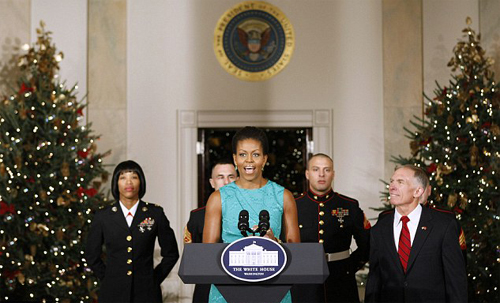 美国总统奥巴马的夫人米歇尔日前召集活动,将充满圣诞气氛的白宫新形象展示给大家,并借机感谢来自24个州的90名志愿者,他们参与了整个白宫的装饰工作。