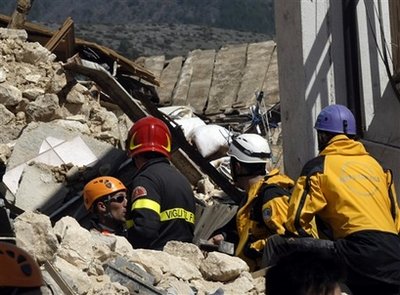 拉奎拉省的平民保护部门官员估计,当地已有三分之二的建筑物倒塌。据估计,数名大学生仍然被埋在一幢大学宿舍的瓦砾下,该处仍有一批救援人员和消防员在泛光灯的照明下进行搜索。