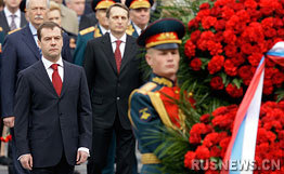 梅德韦杰夫在亚历山大花园克里姆林宫红墙下向无名烈士墓敬献了花圈。俄罗斯总理普京、各部委代表、卫国战争老战士都参加了敬献花圈仪式。