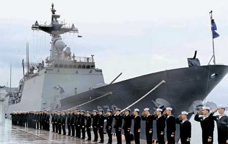 中新网3月4日电 据韩国《中央日报》报道,3日,将被派遣到索马里海域的韩国海军“清海部队”成立仪式在海军作战司令部釜山基地举行。清海部队拥有一艘4500吨级驱逐舰“文武大王舰”、一架反潜直升机和30名履行讯问搜索任务的特战人员等,加上文武大王舰上原有的船员,总规模达到了300多人。