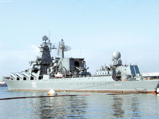 俄罗斯海军也派出素有“航母杀手”之称的“瓦良格”号导弹巡洋舰参加此次阅兵式。该舰已于13日从符拉迪沃斯托克的金角湾出发前往中国。“瓦良格”号是俄罗斯太平洋舰队的旗舰,主要武器为16枚SS-N-12超音速反舰导弹,可携带1000公斤装药的常规弹头或射程达300海里的战术核弹头。
