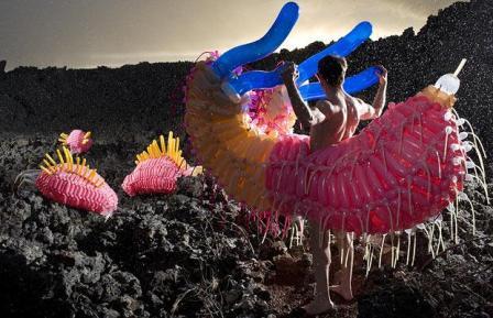 中新网10月31日电 综合报道,像许多二十世纪末的流行艺术家一样,美国艺术家Jason Hackenwerth 善于把常见的材料打造成新的东西,他把几百只气球串在一起形成奇怪的动物、昆虫或外星人,日前在国际上展出。