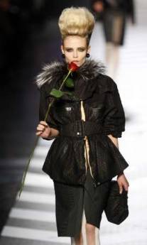 中新网3月10日电 据路透社报道,日前在法国知名时装设计师高堤耶(Jean-Paul Gaultier)的服装秀上,模特们身着用大把钞票模样堆砌而成的黑色礼服,而设计师克里斯汀-拉克鲁瓦(Christian Lacroix)则设计出了巴洛克风格的黄金礼服和大毛皮领。巴黎时装展就是敢于走颓废路线。