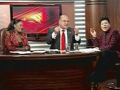 女参选人一脸不屑,故意把水杯碰翻打湿了男议员的膝部,而男士也顾不得风度,马上拿另一杯水迎面还击,女士脸色气得发白。在一旁的主持人震惊地上气不接下气。