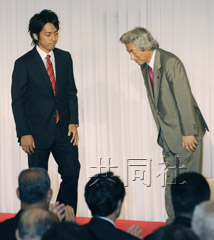 日本前首相小泉纯一郎在演讲会上向接班人次子进次郎行礼。